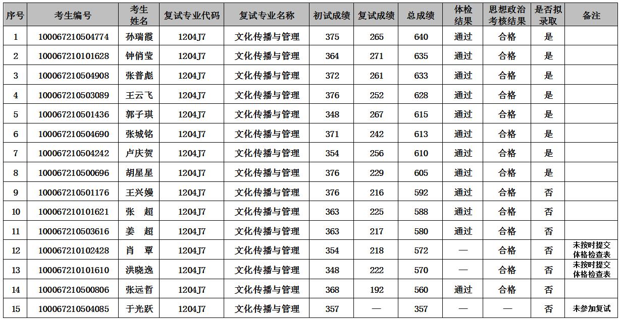 根据《人文与社会科学高等研究院“文化传播与管理”专业2017年硕士研究生调剂复试方案》的有关要求,我院研究生招生工作组对参加调剂复试的考生进行了专业英语及口语面试、综合面试以及思想政治考核,现将复试结果公示如下: